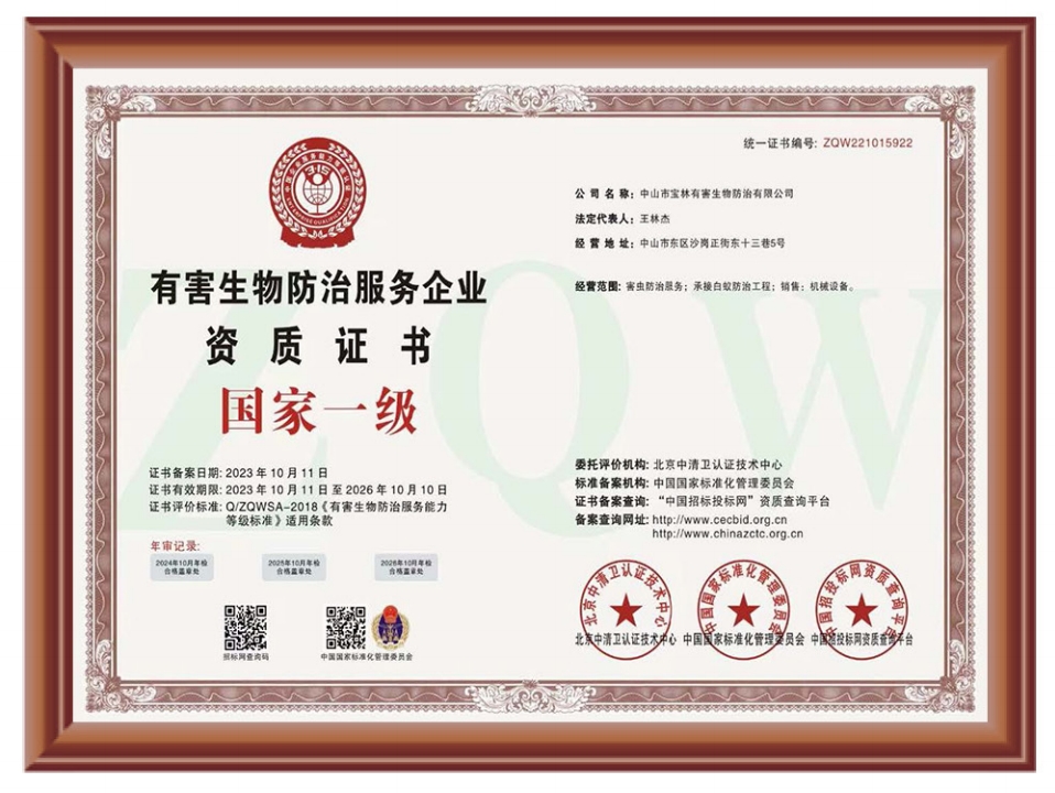 中山市宝林生物防治有限公司,拥有预防资深专家和技能娴熟的专业团队,是—家最具有实力的专业从事PCO工作的杀虫公司。主要从事有害生物消杀防治工作(PCO),消杀部不断吸取专业知识,具有有害生物的防治工作经验及先进的技术和最佳的灭虫药品。公司消杀工程部以丰富的除四害经验、专业的技术、优质的服务对各大型单位、宾馆、酒店餐饮、商场、学校、食品加工厂、企事业单位以及社区家庭提供杀虫灭鼠,害防白蚁筹工作。监测及消杀服务工作,提供—次性、定期、常年消毒、杀虫、灭鼠、灭蟑螂、灭蚊蝇、灭臭虫、灭白蚁等服务。速净有害生物治服务,有限公司在近几年的实际工作中,本着良好的信誉,优质的服务,过硬的技术帮助了大型宾馆,洒店,商场,学校,食品加工厂,企事业,社区筹多家单位达到有效的防冶,并在PCO行业服务中获得了大家的认可与好评!